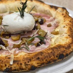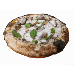 €9,00Bianca, fior di latte, porchetta, melanzane a funghetto, rosmarino, scaglie di caciocavallo e burrata.