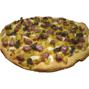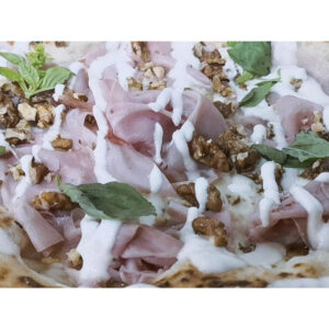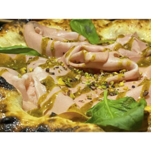 €9,00Base bianca, fior di latte, guanciale, pistacchio di Bronte, mandorle, basilico, olio evo.