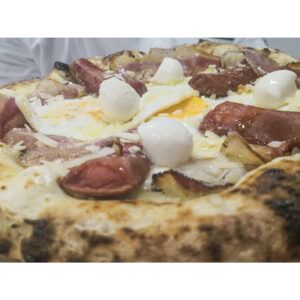 €9,00Base bianca, fiordilatte, patate al forno aromatizzate, bacon grigliato, wrustel fritti, uovo fritto,origano.