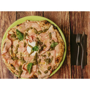 €11,00Base bianca, fior di latte, burrata, pesto pistacchio di Bronte, mortadella I.G.P. Bologna, sbriciolata di taralli, basilico, olio evo.