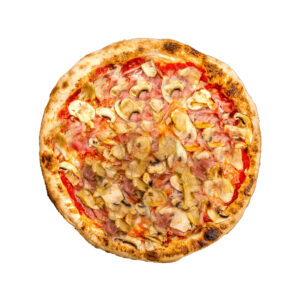 Fior di latte, pomodoro, carciofi, olive, prosciutto cotto, funghi.