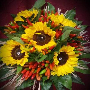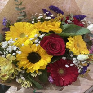 €20,00 – €60,00Bouquet di girasoli con fiori misti di stagione dai toni vivaci, confezionato con verde decorativo. Adatto in qualsiasi occasione. Esprime allegria.
