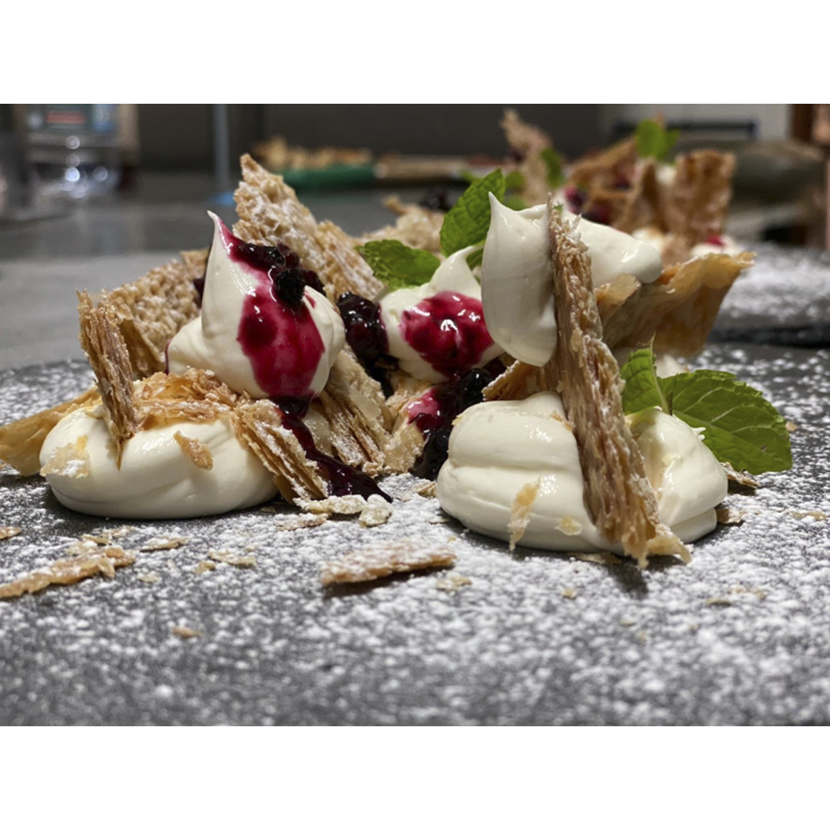 Con crema chantilly, frutti di bosco e mentuccia.